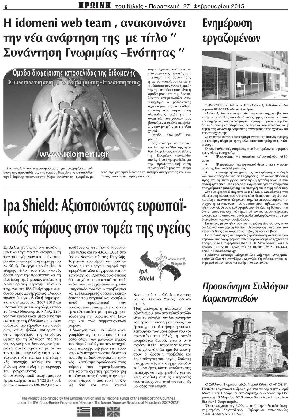 Άρθρο για το έργο στην εφημερίδα Πρωινή στις 27.02.2015
